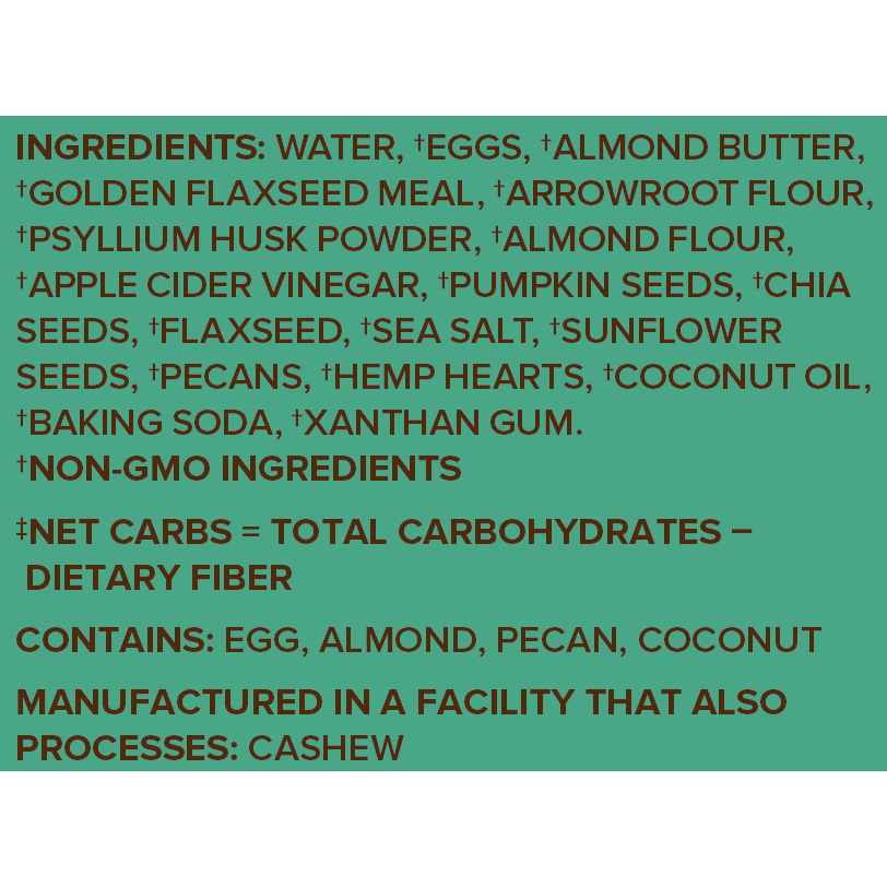 WATER, EGGS, ALMOND BUTTER, GOLDEN FLAXSEED MEAL, ARROWROOT FLOUR, PSYLLIUM HUSK POWDER, ALMOND FLOUR, APPLE CIDER VINEGAR, PUMPKIN SEEDS, CHIA SEEDS, FLAXSEED, SEA SALT, SUNFLOWER SEEDS, PECANS, HEMP HEARTS, COCONUT OIL, BAKING SODA, XANTHAN GUM.
