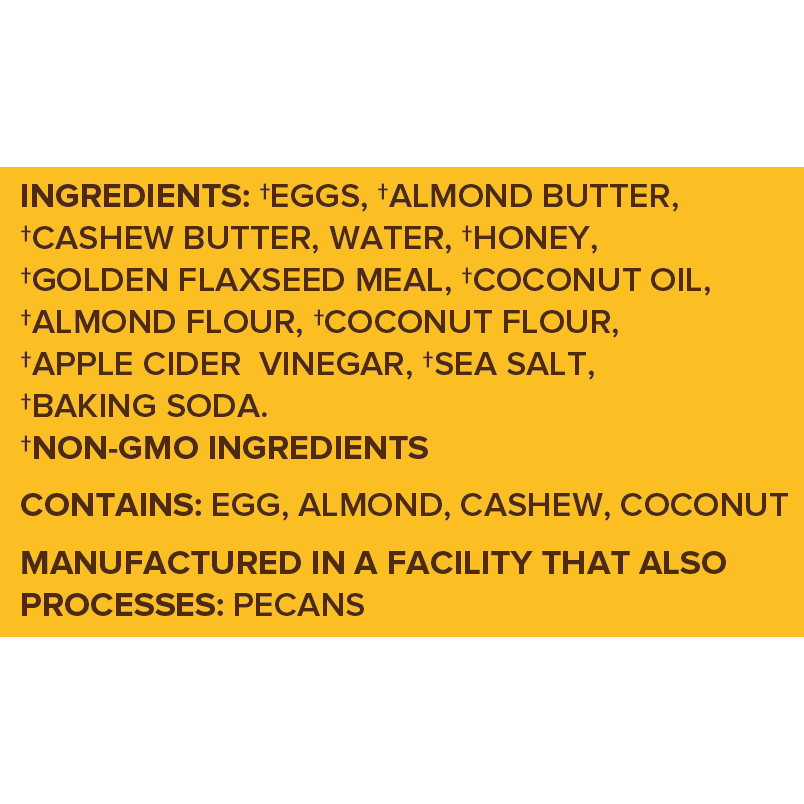INGREDIENTES: EGGS, WATER, TAPIOCA FLOUR, CASHEW BUTTER, ALMOND BUTTER, GOLDEN FLAXSEED MEAL, HONEY, COCONUT OIL, ALMOND FLOUR, COCONUT FLOUR, APPLE CIDER VINEGAR, PSYLLIUM HUSK POWDER, SEA SALT, BAKING SODA