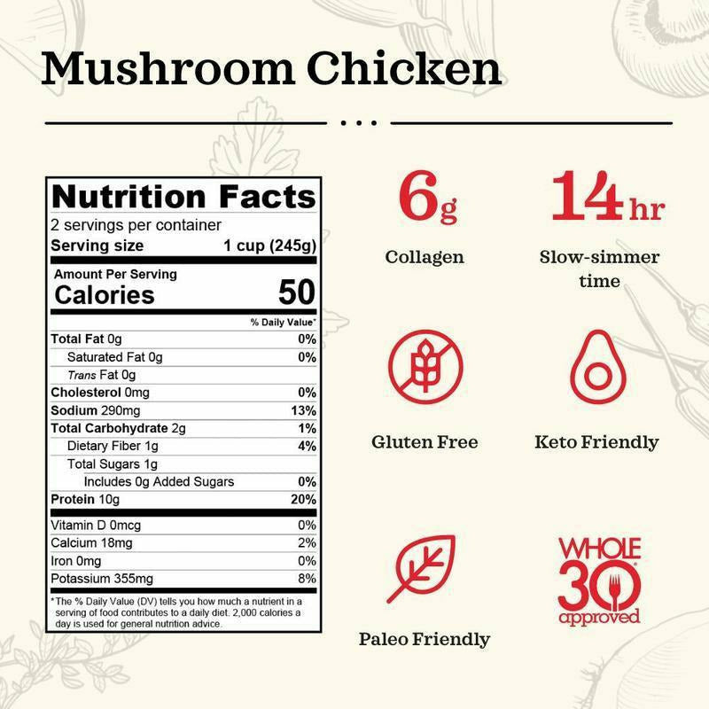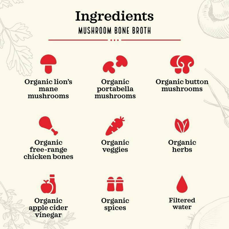 Chicken Bone Broth (Filtered Water, Organic Chicken Bones, Organic Apple Cider Vinegar), Chicken Broth, Organic Portabella Mushrooms, Organic Celery, Organic Roasted Poblano Pepper, Organic Green Pepper, Organic Onion, Organic Carrots, Organic Garlic, Organic Scallions, Organic Tomato Puree, Organic Lion's Mane Mushroom Powder, Organic Herbs (Parsley, Thyme, Rosemary, Basil), Organic Spices, Organic Black Pepper, Sea Salt.