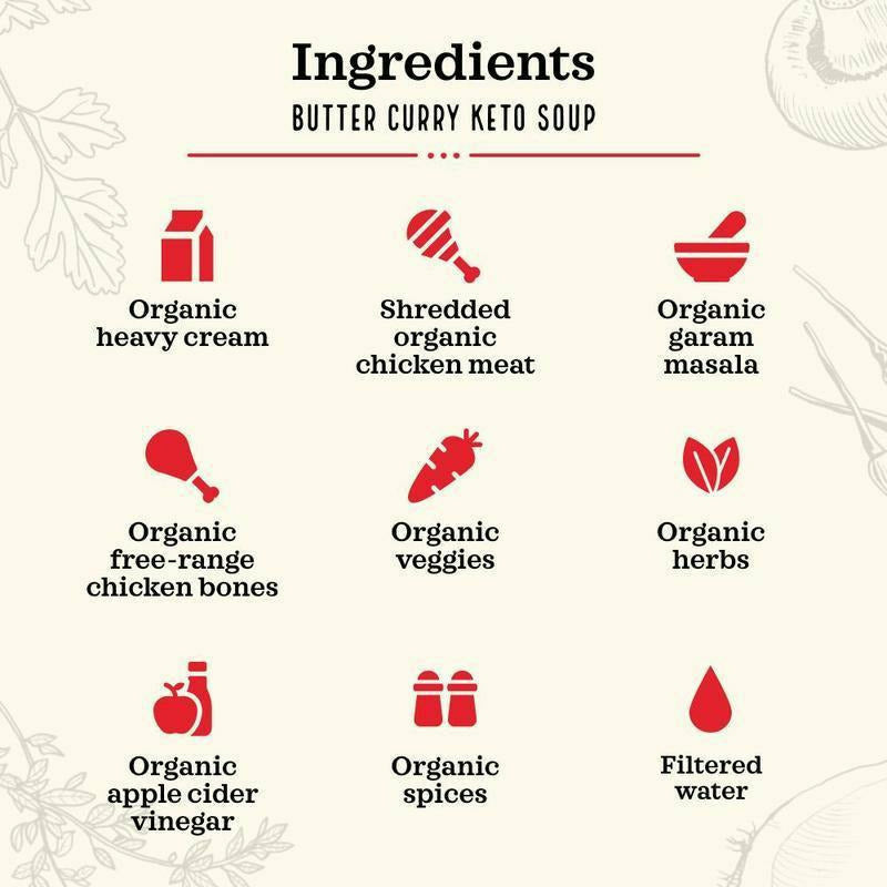 Water, Organic Cream, Organic Chicken Bone Broth (water, organic chicken bones, organic onions, organic carrots, organic fennel, organic leeks, organic apple cider vinegar, organic thyme, organic shiitake mushroom, organic tamarind extract, organic bay leaf), Organic Butter (organic pasteurized cream, salt), Less Than 2% Of Organic Cooked White Meat Chicken, Organic Carrots, Organic Ginger Puree, Organic Jalapeno Peppers, Organic Garlic, Organic Tomatoes in Tomato Puree (Tomatoes, Tomato Puree, Citric Acid), Organic Onions, Xanthan Gum, Organic Garam Masala Spices, Sea Salt, Organic Turmeric, Organic Lemon Juice Concentrate, Organic Spices. Contains Milk