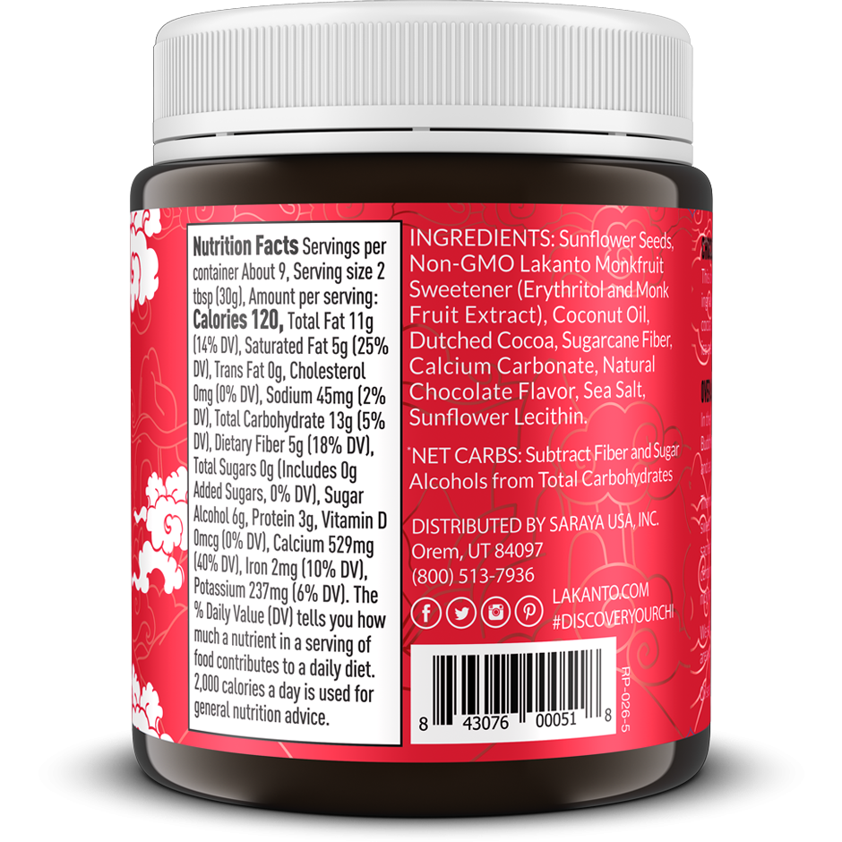 INGREDIENTES: Sunflower Seeds, Non-GMO Lakanto Monkfruit Sweetener (Erythritol and Monk Fruit Extract), Coconut Oil, Dutched Cocoa, Sugarcane Fiber, Calcium Carbonate, Natural Chocolate Flavor, Sea Salt, Sunflower Lecithin