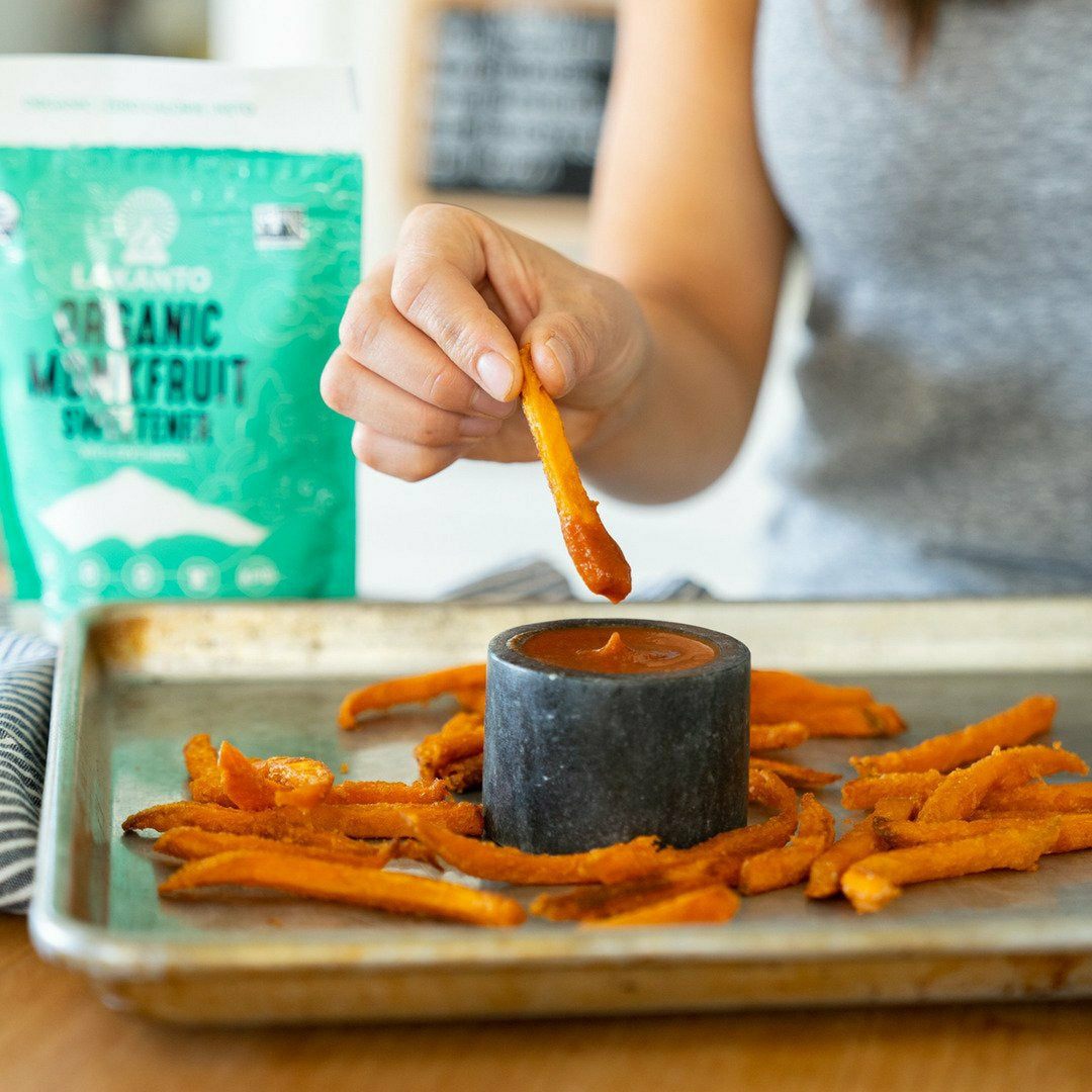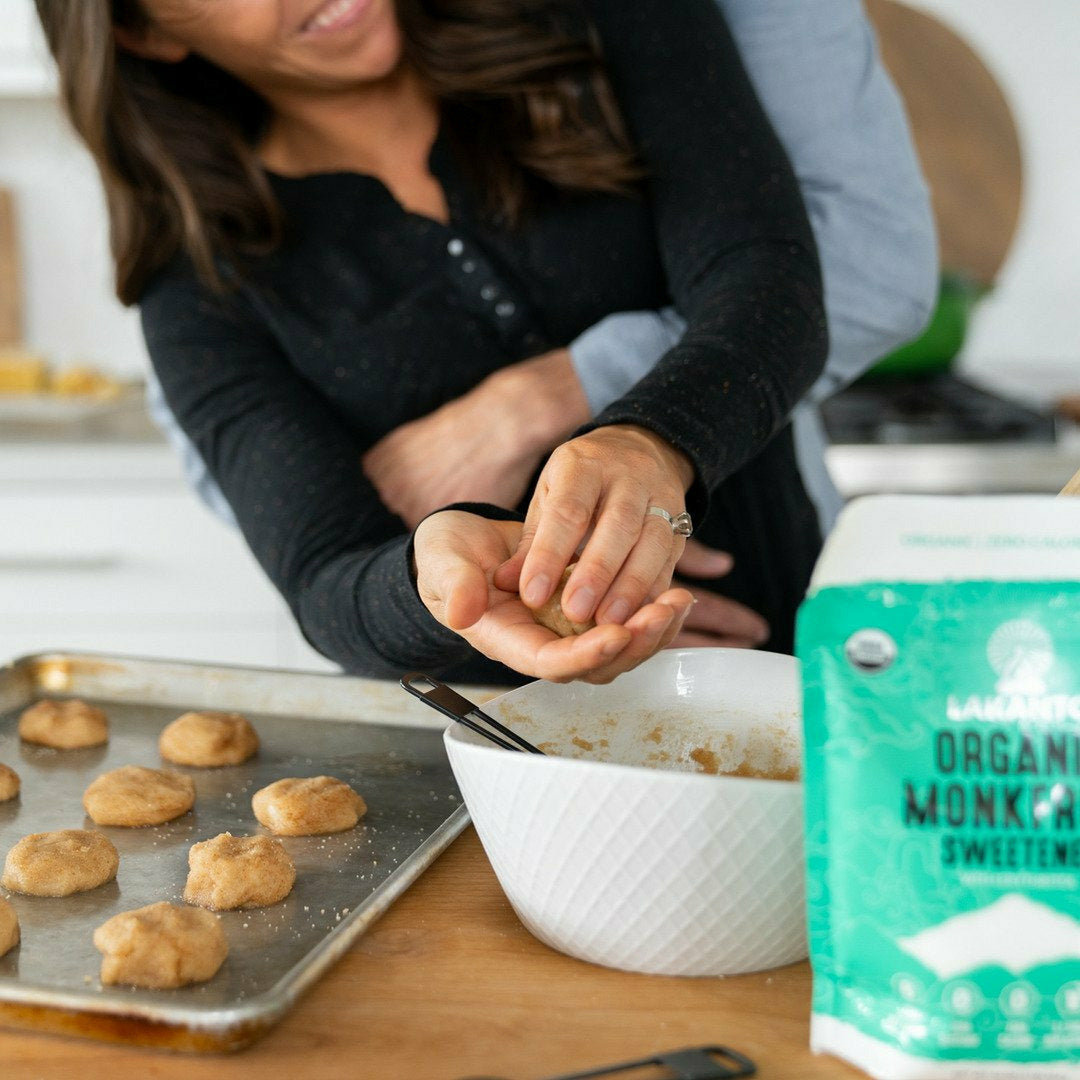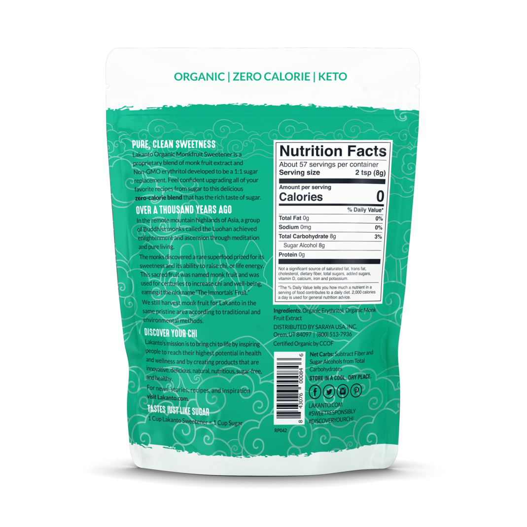 Lakanto Organic Monkfruit Sweetener es una mezcla patentada de extracto de monkfruit y eritritol no GMO desarrollado para ser un reemplazo de azúcar 1:1.