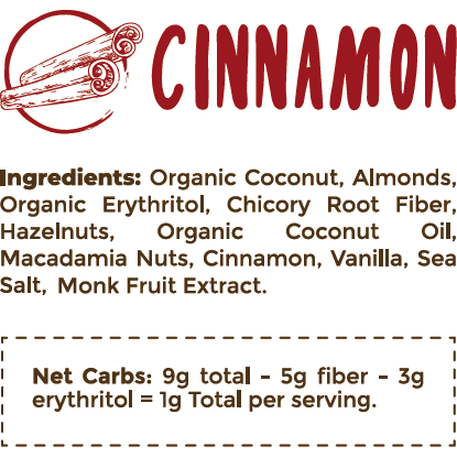 INGREDIENTES: Coco Orgánico, Almendras, Erythritol Orgánico, Chicory Root Fiber, Avellanas, Aceite de Coco Orgánico, Nueces de Macadamia, Canela, Vainilla, Sal Marina, Monkfruit.