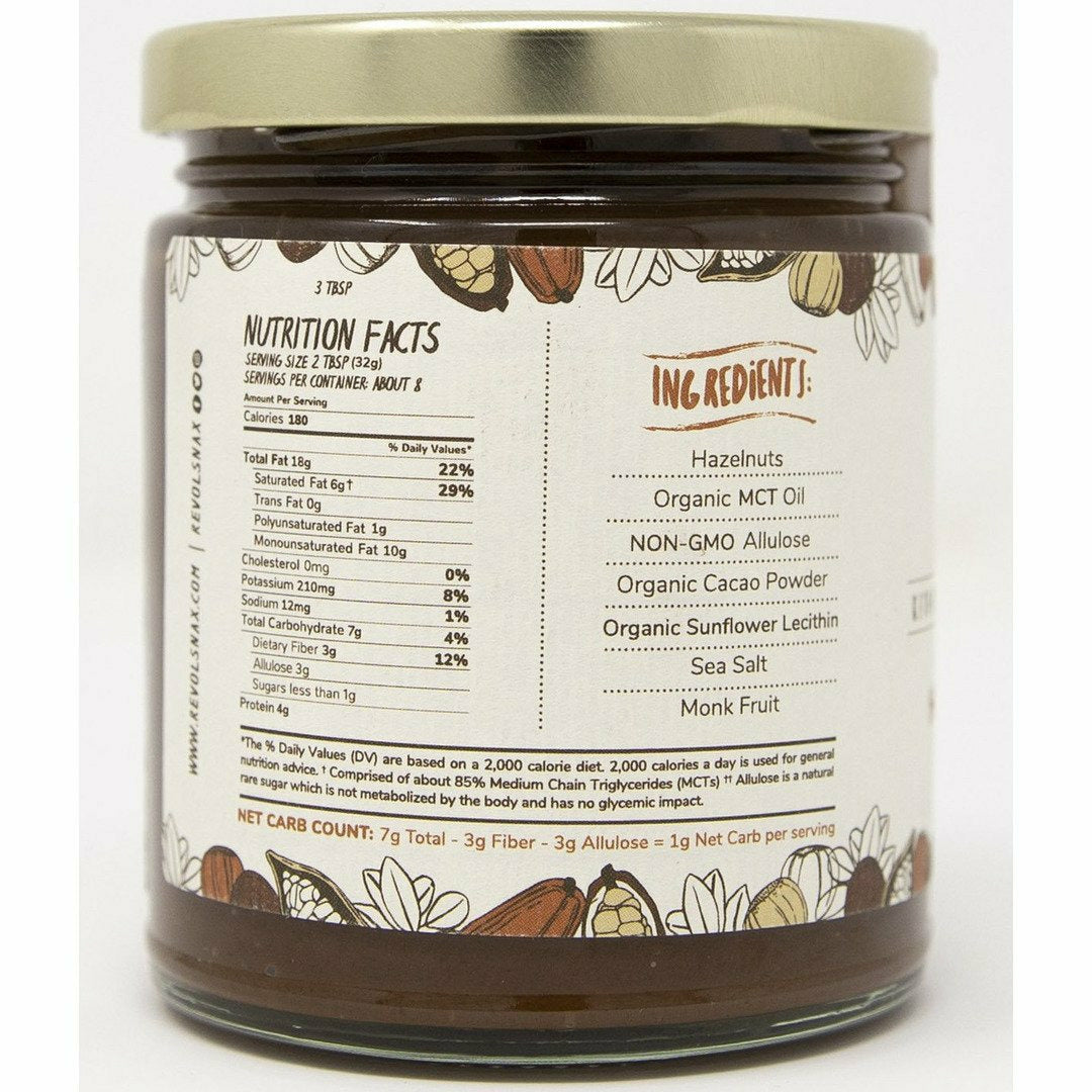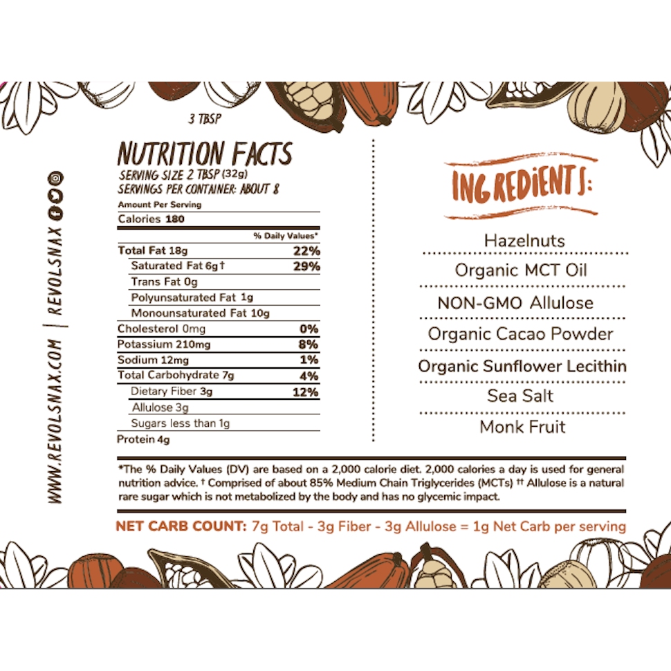 Ingredientes: AVELLANAS, ACEITE MCT ORGÁNICO, ALULOSA NO GMO, CACAO EN POLVO ORGÁNICO, LECITINA DE GIRASOL ORGÁNICA, SAL DE MAR, FRUTA DE MONJ