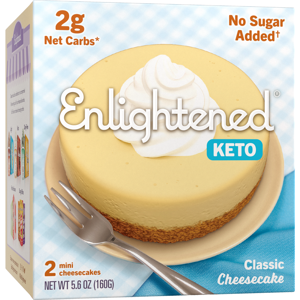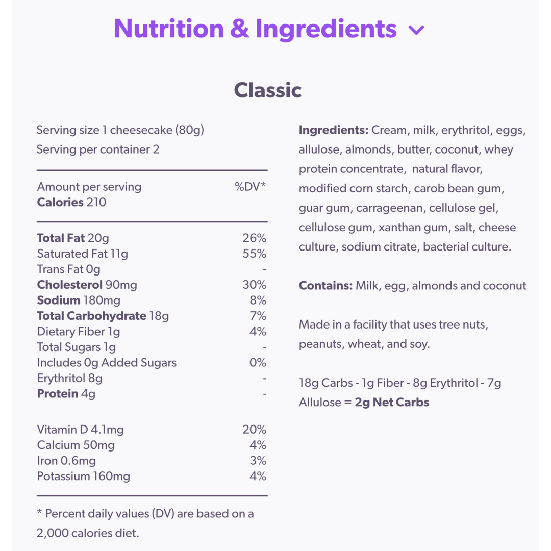 ¡El postre legendario finalmente está disponible sin azúcar agregada! Cheesecake original al estilo de Nueva York con un crust de vainilla y almendras, cubierta con crema batida. Cada cheesecake de queso clásico tiene 210 calorías con solo 2 g de carbohidratos netos.